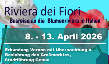 Bayern Blumengroßmärkte Italien Vom 8. bis 13. April 2026 organisiert der Blumengroßmarkt München eine sechstägige Busreise nach Italien an die Blumenriviera. Auf dem Programm stehen unter anderem der Großmarkt Verona, eine Stadtführung in Genua, der Blumenmarkt Sanremo...