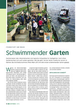 Wasser, als lebensnotwendiges Element, wurde bei dieser Installation zur Tragfläche. Beim Architektursommer Rhein-Main 2015 (ASRM 2015) ging es darum, zukunftsträchtige Visionen von Wohn- und Lebensräumen im Rhein-Main-Gebiet vorzustellen. Auch das Thema der Nahversorgung sollte dabei nicht vergessen werden. Also hat der Verein Frankfurter Garten zusammen mit den Architekten Ian Shaw und Céline Scherer einen Ponton mit Kohl, Topinambur und Petersilie begrünt. Um die tägliche Pflege der Beete kümmerten sich die Urban Gardener, schließlich hatten sie den schwimmenden Garten als ihr Projekt ins Herz geschlossen. Mit dem Ponton wollten die Macher des größten Urban-Gardening- Projekts in Hessen auf die natürlichen Kreisläufe von Erde, Wasser...