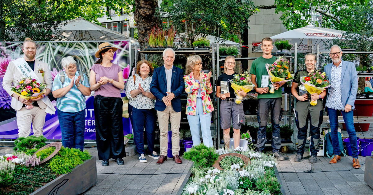 Zusammen mit ZVG-Präsidentin Eva Kähler-Theuerkauf und Hannes Schrader, Botschafter der Gärtner und Floristen, der in diesem Jahr die Wahl zur Deutschen Blumenfee gewonnen hat, wurden die besten drei Friedhofsgärtner feierlich geehrt.