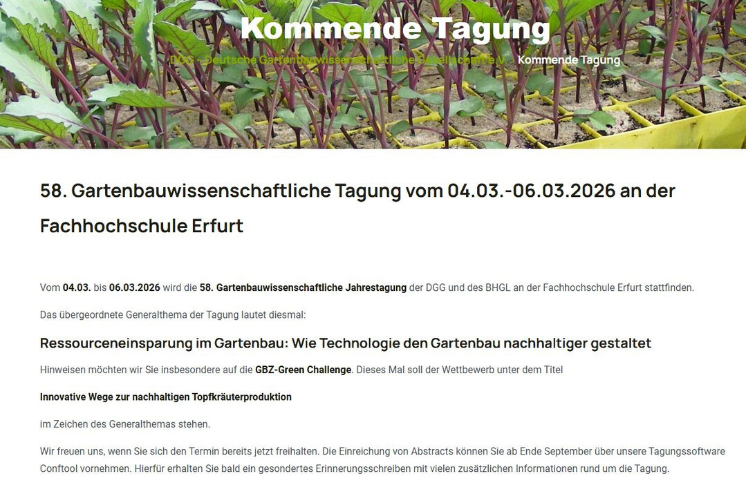 Die 58. Gartenbauwissenschaftliche Jahrestagung der Deutschen Gartenbauwissenschaftlichen Gesellschaft (DGG) und des Bundesverbandes der Hochschulabsolventen/Ingenieure Gartenbau und Landschaftsarchitektur (BHGL) findet vom 4. bis 6. März 2026 unter dem Motto „Ressourceneinsparung im Gartenbau: Wie Technologie den Gartenbau nachhaltiger gestaltet“ an der Fachhochschule Erfurt statt.