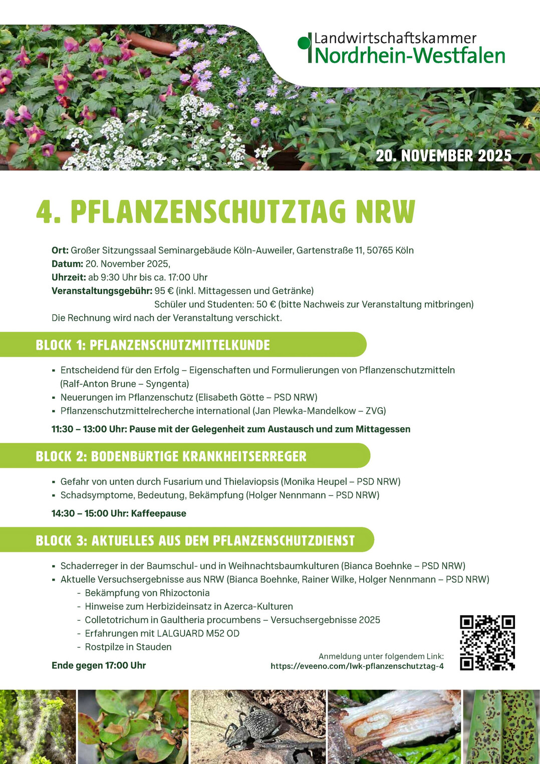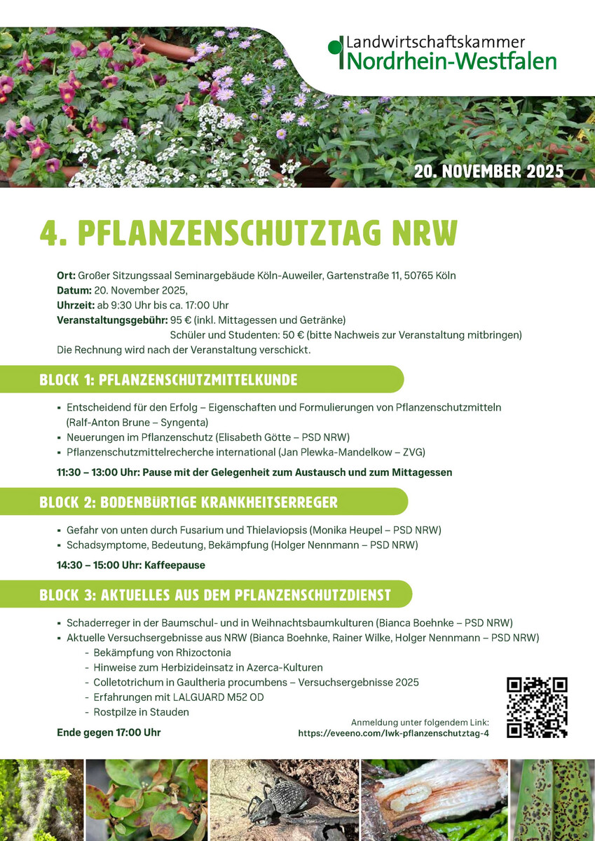 Am 20. November 2025 findet in Köln-Auweiler ab 9.30 Uhr der 4. Pflanzenschutztag NRW für Zierpflanzen und Gehölze statt.