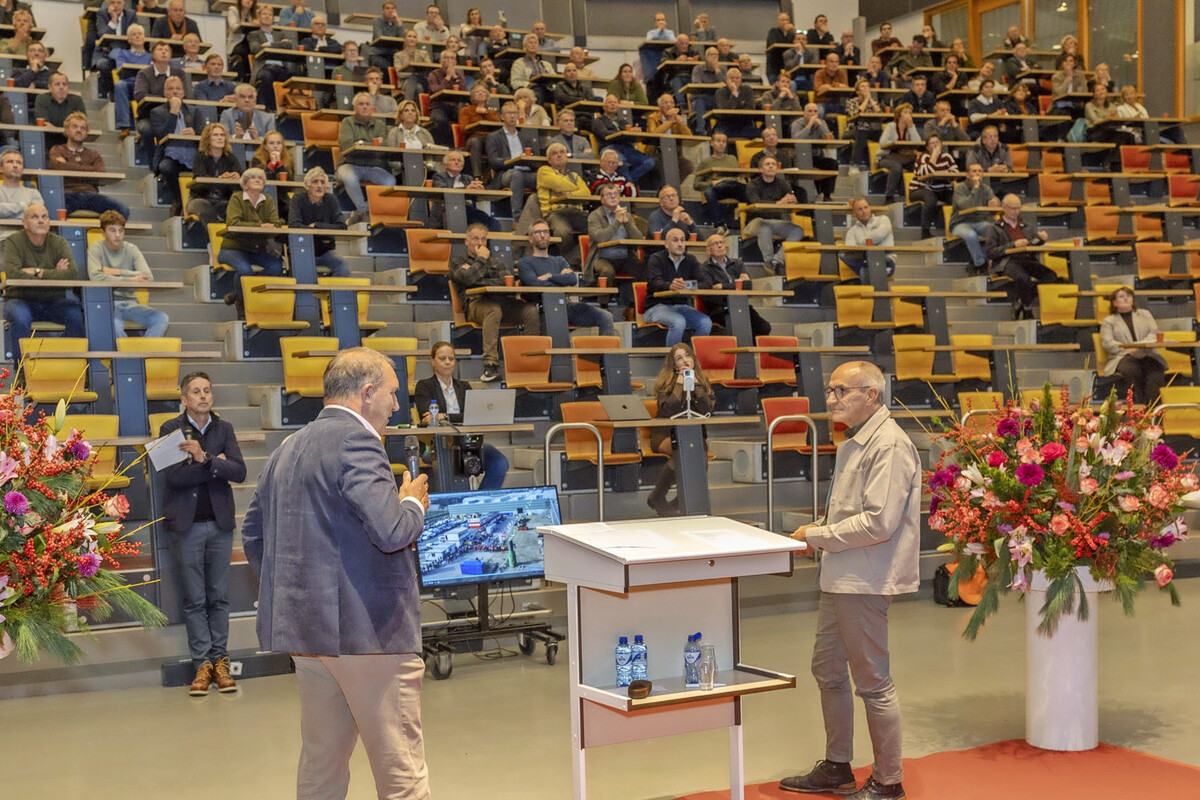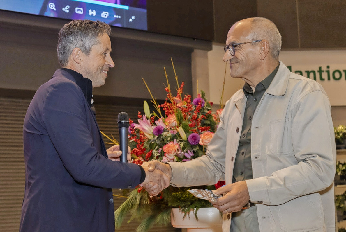 Im Anschluss an die Mitgliederversammlung wurde in der Versteigerungshalle Abschied von Vertriebs- und Marketingdirektor Guus van Logtestijn genommen. Guus wurde mit vielen wertschätzenden Worten geehrt – passend zu 43 Jahren treuem Einsatz, in denen er sich vom Assistenz-Kontrolleur zum Vertriebs- und Marketingdirektor entwickelte und zu einer prägenden Figur der Branche wurde. Er wurde mit der goldenen Plantion-Anstecknadel geehrt.