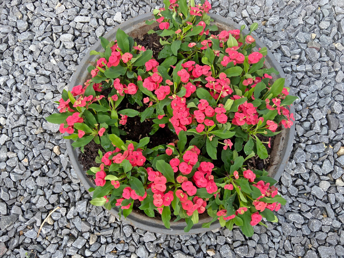 Ergänzt wird das Substrat durch die äußerst robuste Euphorbia „Hot Milii“ (Christusdorn), die Trockenheit, Hitze und intensive Sonneneinstrahlung souverän meistert und mit beständiger Vitalität punktet. Ihre geringe Verdunstungsrate macht sie zu einer idealen Wahl für Standorte, an denen Hitze und Wassermangel zum Alltag gehören.