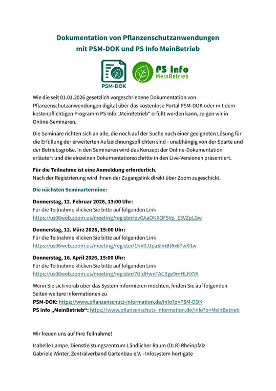 Die Online-Seminare richten sich an Betriebsleiter, Produktionsverantwortliche, Pflanzenschutzberater und Mitarbeiter, die mit der Erfassung und Verwaltung von Pflanzenschutzanwendungen betraut sind. Angesichts steigender Anforderungen an Nachvollziehbarkeit und Kontrolle im Pflanzenschutz sollen die Veranstaltungen dazu beitragen, Dokumentationsprozesse zu standardisieren und praktische Probleme im Betriebsalltag zu reduzieren.