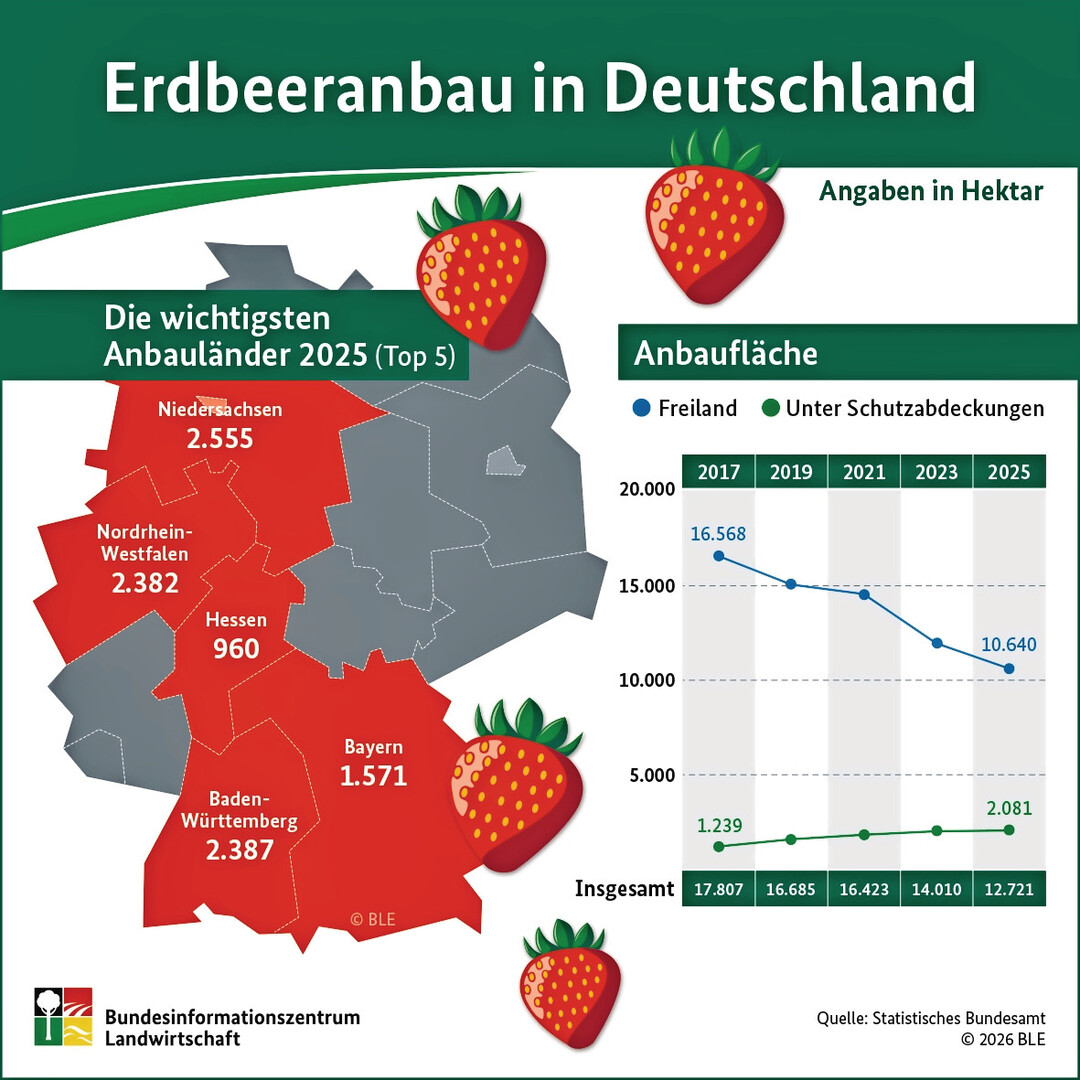 von BLE erschienen am 26.03.2026Das liegt vor allem daran, dass immer weniger Erdbeeren im Freiland angebaut werden. Der Anbau unter Schutzabdeckungen hingegen nimmt kontinuierlich zu. Hier fallen die Erträge pro Hektar mehr als doppelt so hoch aus wie im Freiland. 2023 wurde erstmals die Grenze von 2.000 Hektar Anbaufläche unter Schutzabdeckungen durchbrochen und 2025 mit 2.081 Hektar ein neuer Rekordwert erreicht. Die Flächenverluste im Freiland können diese Zugewinne aber nicht annähernd ausgleichen.