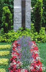 Grabgestaltung: Der rund 30cm hoch wachsende Lavendel gehört auf große Gräber. Für kleine Grabstätten werden die Pflanzen einfach zu groß. Das graugrüne Laub ist immer attraktiv. Auch ohne Blüte macht die Pflanze eine gute Figur. Nach der Blüte im Frühsommer müssen die Pflanzen um rund ein Drittel zurückgeschnitten werden, damit ein schöner kompakter Aufbau und die gewünschte Blütenfülle erhalten bleiben. Lavendel ist in Wechselbeeten deshalb in der Regel nur zwischen Dauerblühern zu sehen, auf größeren Gräbern passt er aber als ausdauernde Pflanze auch in die Rahmenbepflanzung. Die Pflanzen lassen sich mit dem Schnitt zu kleinen Hecken formen, die dank der Winterhärte sehr alt werden können. Lavendel schätzt einen sonnigen Standort, durchlässige Böden werden bevorzugt. Andere Lavendel-Arten sind ebenso dekorativ und ausdauernd wie der Klassiker, leider duften sie aber oft nicht so intensiv.