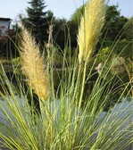 Die neue Züchtung Cortaderia selloana trägt die Bezeichnung ‘Golden Goblin’. Sie hebt sich sowohl mit ihrer Optik als auch mit ihren Eigenschaften von den herkömmlichen Cortaderia-Sorten ab. ‘Golden Goblin’ ist sehr blühfreudig und zeichnet sich von August bis Oktober durch zahlreiche weißgoldene Blütenwedel über den grün-gelb gestreiften Blättern aus.