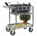 Die untere Ablage nimmt Blumen, Erde oder Torfsäcke auf. Seitliche Verblendungen eignen sich als Werbeflächen für Ihren Betrieb. Der Wagen macht sich auch beim Pflegegang durch die Verkaufstische in Gartencenter oder Gärtnerei bezahlt.