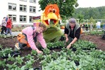 Unterstützung erhalten die Gärtner der Firma Boymann aus Glandorf, die noch bis Ende nächster Woche im Akkord pflanzen, übrigens vom LGS-Maskottchen Raudi Raupe. Die freche Raupe hat die Blümchen zwar eigentlich zum Fressen gern, den Gärtnern und Besuchern aber fest versprochen, die Pflanzen in Ruhe zu lassen. /LGS Hemer