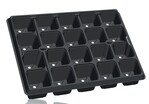 Exakt ausgestanzte Löcher im Kulturboden der Einzelzellen sorgen für ein leichtes Be- und Entwässern. Die einzelnen Zellen fassen mit der optimierten Form jetzt 110 ml Substrat. Dank ihrer leicht konischen Form helfen sie den Pflanzen dabei, gute Wurzelballen zu bilden, die sich durch einen leichten Druck auf den Boden einfach aus den Trays herauslösen. Die Trays mit 20 Töpfchen sind 21 cm breit, 28 cm lang, 6 cm. Somit können 335 Pflanzen/m² kultivieren werden. 12 x 20 Pflanzen passen auf eine CC-Lage.