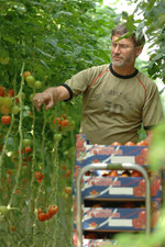 "Bei uns ist alles sauber und aufgeräumt, wir gehen schließlich mit Lebensmitteln um", beschreibt Gärtner Theo Germes den Zustand in seinem Betrieb. Germes baut in seinen Gewächshäusern im großen Stil Tomaten, Paprika und auch Gurken an. In der modernen Kultur steht die Pflanze nicht mehr in gewachsenem Boden, sondern werden in erdlose Substratwürfel aus einem Steinwolle/Kokosfasergemisch gepflanzt. Diese liegen in Kulturrinnen, die etwa einen halben Meter über dem Boden hängen. Durch Tröpfchenbewässerung wird jede einzelne Tomatenpflanze je nach Sonneneinstrahlung mit Wasser und darin gelöstem mineralischem Dünger kontinuierlich versorgt. In einem geschlossenen Wasserkreislauf wird überschüssiges Wasser permanent gereinigt und thermisch, also durch Hitze, desinfiziert. Die Düngergaben sind sehr gezielt und man kann so das Wachstum genau beeinflussen.