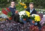 „Vor allem die knallig bunten Chrysanthemen-Kugeln bringen noch einmal sommerliches Feuer auf Balkon und Terrasse,“ schwärmt Gärtnermeister Wolfgang Graf (rechts im Bild), „vor allem, wenn sie schon wie hier im passenden Farbenmix zusammengewachsen sind.“