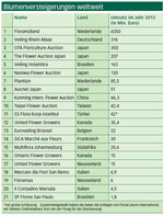 Einen Überblick über wichtige Versteigerungen weltweit gibt nebenstehende Tabelle. Den mit weitem Abstand größten Umsatz macht das niederländische Unternehmen FloraHolland mit 4,35 Mrd. Euro. Auf Platz 2 folgt die deutsche Veiling Rhein-Maas. Deutlich wird, dass sich der Blumenhandel immer mehr auch in Ländern etabliert, die bisher wenig im Fokus standen.
