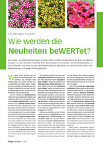 Welche Sorten konnten sich bis Mitte Juli durch Blütenfülle hervorheben und vertrugen viele Niederschläge und raschen Wechsel von sonnig-heißen und kühlen Tagen? Folgen-de Sorten erhielten ab Mitte Mai auf dem Pillnitzer Probefeld bis zum Beet- und Balkonpflanzentag höchste Boniturnoten für Blühstärke und Gesamteindruck. Aus der Vielzahl der Petuniensorten hoben sich durch gute Wetterfestigkeit und zahlreiche Blüten mit interessanter Zeichnung 'Pegasus Magenta Star' (Herkunft Volmary) und 'Surprise Purple Dance' (Herkunft Dümmen Orange) hervor. Auf-grund einer schnellen Anzucht im Gewächshaus, eines aufrechten Wuchses, einer guten Verzweigung und einer gleichmäßigen Zeichnung der weißen Blüten mit dunkelrosa Streifen fiel 'Pegasus Magenta...