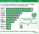 Die schwachen Entwicklungen bei den großen Kulturen Geranien und Sommerheide dürften zum schwachen Wachstum beigetragen haben. Hier stimmt die abermals gesunkene Einkaufsmenge nachdenklich. Die Konkurrenz in der Frühjahrs- und Sommersaison durch die sich stetig erweiternde Palette an Beet- und Balkonpflanzen kann das Minus bei den Geranien ein Stück weit erklären. Diese Erklärung greift jedoch nicht für das Minus der Sommerheide. Hier mag sich negativ auswirken, dass die Kombipots flächendeckend angeboten werden, die pro Topf natürlich deutlich mehr Farbe bieten als eine klassische Einzelpflanze. Die Abstände in den Top 10 sind im Segment der Beet- & Balkonpflanzen aufgrund des schnellen Saisonwechsels deutlich kleiner, wodurch sich die Platzierungen dynamischer entwickeln als in den anderen Segmenten.