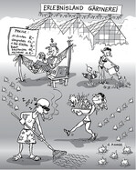 Unser Gärtner mag vom bekannten amerikanischen Autor Mark Twain gelernt haben, der seine berühmte Figur Tom Sawyer erfolgreich die eigentlich stupide Aufgabe des Zaunstreichens erfolgreich an andere verkaufen lässt. Warum nicht die wiederkehrenden und teils mühsamen Aufgaben in einer Gärtnerei einfach an erlebnishungrige Zeitgenossen abgeben – und dafür noch Geld verlangen? Wir sind gespannt, ob die Idee unserer Karikatur vielleicht tatsächlich den einen oder die andere dazu inspiriert, aus der Gärtnerei ein grünes Erlebnisland zu machen.