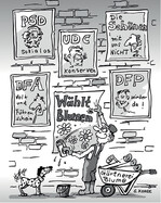 In Zeiten des Wahlkampfs sind unsere Straßen von den Plakaten der Parteien geprägt. Immer wieder wundern wir uns, mit welch einfachen Sprüchen und Schlagworten man uns als Wähler zu werben versucht. Und erwartet tatsächlich jemand ernsthaft, von uns gewählt zu werden, weil er es geschafft hat, fünf Plakate mehr als die politische Konkurrenz aufzuhängen? Da ist die Idee der Gärtnerei Blume in der Welt unserer Karikatur doch gar nicht so schlecht, zwischen all die plakatierten Politgesichter mit einem Poster für Blumen zu werben und die Leute daran zu erinnern, woran sie garantiert und dauerhaft Freude haben werden.
