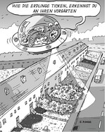 Auf der Suche nach besonders intelligentem Leben auf der Erde sind diese Aliens auf eine findige Methode gekommen: Sie halten sich an die Gestaltung der Vorgärten. Und die prächtig mit vielen Pflanzen angelegte Fläche hat es ihnen mehr angetan als die nachbarschaftlichen Vorgartenwüsten – auch wenn diese eher an heimatliche Gefilde auf dem Mars erinnern. Gut, dass sich die Ufo-Leute auf ihrem Flug zur Erde mit Fachliteratur kundig gemacht haben ...