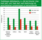 Zur Verbesserung der Bewurzelung wurde im Herbst 2017 ein erster Test in einer Klimakammer durchgeführt. Es wurden zwei Petuniensorten ('Lilac Dark Vein' und 'Dark Red') unter sechs Belichtungsvarianten getestet. Bei diesen handelte es sich um Hellrot (660 nm), Blau (440 nm), Weiß (4000 K) und eine Kontrollvariante mit herkömmlichen Natriumdampf-Hochdrucklampen, sowie der Mischung von Hellrot und Blau (Verhältnis 1 : 1) und Hellrot, Blau und Weiß (Verhältnis 1 : 1 : 1). Die durchschnittliche Beleuchtungsstärke im Bestand betrug 65 µmol/m 2 ×s, durchschnittlicher Wert im Bestand bei einem Abstand von 60 cm zwischen Bestand und Leuchte). Belichtet wurde 16 Stunden pro Tag.