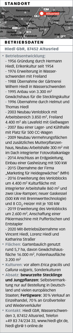 Die Lage im Allgäu Helmut Hiedl schildert die Vor- wie auch die Nachteile. Um mit letzteren anzufangen: Wir sind von den großen Anbauzentren ziemlich weit entfernt." Das Unternehmen hat damit nicht die Möglichkeiten des grünen Großhandels oder spezialisierter Logistikunternehmen, wie es sie am Niederrhein gibt. Das bedeutet: All das machen wir selbst von der Kundenakquise über die Logistik und die gesamte Betreuung des Absatzes." Auf der anderen Seite ist die Lage aber auch eine große Stärke: Wir sind hier für uns und für viele Kunden eben automatisch Ansprechpartner für Eriken und Callunen." Die Lage im Süden Deutschlands bietet einen weiteren Vorteil: nach Österreich und Südtirol ist es nicht weit und für Kunden dort kommt Hiedl deshalb als Lieferant aus Deutschland als einer der ersten infrage.