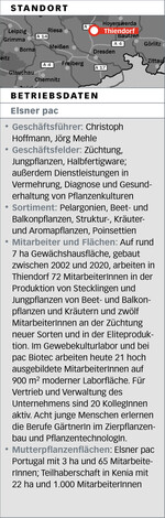 Bekannt ist Elsner pac vor allem für sein hervorragendes Pelargoniensortiment aus eigener Züchtung. Wurden die in früheren Jahren insbesondere über Lizenzen vermarktet, ist das Unternehmen mit seinen jüngst nochmals gewachsenen Produktionskapazitäten selbstverständlich auch Lieferant von Jungpflanzen. Und längst bietet das Unternehmen auch ein breites Sortiment an Beet- und Balkonpflanzen an, wozu auch Kräuter und Duftpflanzen gehören. Strategisches Ziel ist, für die Kunden Sortimente für das ganze Jahr bieten zu können.