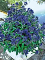 Die Neuzüchtung Caryopteris cladonensis ‘Symphonie in Blue’ ist eine Kübelpflanze für Balkon, Terrasse und Garten. Es handelt sich bei der Pflanze um einen laubabwerfenden Halbstrauch mit kompaktem Wuchs. Er wird nur etwa 50 × 50cm groß. Die Blütenfarbe schwankt zwischen kräftigem Nachtblau und leichtem Lila. Die Blüten sind halbgefüllt und blühen von August bis Oktober in dichten Trauben. Durch sattes, glänzendes Grün fallen die Blätter auf. Caryopteris sollte in einer sonnigen, windgeschützten Lage ausgepflanzt werden. Wichtig ist dabei ein durchlässiger, sandiger und humoser Boden. Die Pflanze sollte feucht gehalten werden, verträgt aber keine Staunässe. PR
