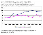 Bei den als Handelsbetrieben bezeichneten, auf den Einzelhandel spezialisierten Betrieben gab es in den vergangenen Jahren folgende Entwicklung: Die Umsätze der Betriebe des 1. Drittels verdoppelten sich und erreichten ein durchschnittliches Niveau von knapp unter 1 Mio. €. Damit machen die erfolgreichen Handelsbetriebe fast den doppelten Umsatz wie die erfolgreichen Einzelhandelsgärtnereien. In keinem der vergangenen zehn Jahre erwirtschafteten sie negative Reinerträge. Dieses 1. Drittel bewies somit nachhaltige Rentabilität, während die Durchschnittsergebnisse durch die ungünstigen Zahlen der weniger erfolgreichen, meist deutlich kleineren Betriebe ins Negative gerieten.