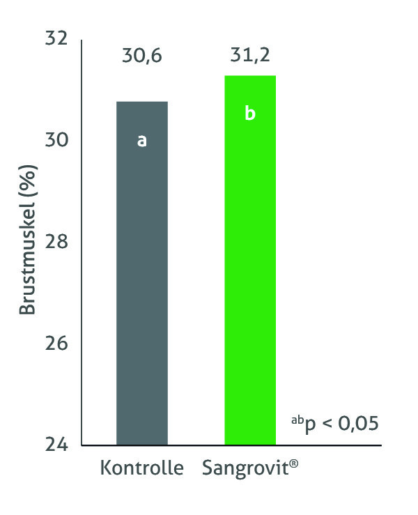 Eine Vielzahl an Studien zu Sangrovit® belegen die Bedeutung einer stabilen Darmbarriere für Leistung und Tiergesundheit. So konnte die Genexpression von Claudin – einem wichtigen Barriereprotein – gesteigert werden (Abb. 1). In einem Hitzestressversuch zeigte sich zudem eine verringerte Darmpermeabilität (FITC-Dextran Modell) und eine verbesserte Futterverwertung (Kikusato et al., 2021). Aktuelle Untersuchungen bestätigen darüber hinaus die positiven Sangrovit®-Effekte auf Endgewicht und Futterverwertung (Abb. 2) sowie auf wertvolle Teilstücke des Schlachtkörpers (Abb. 3).