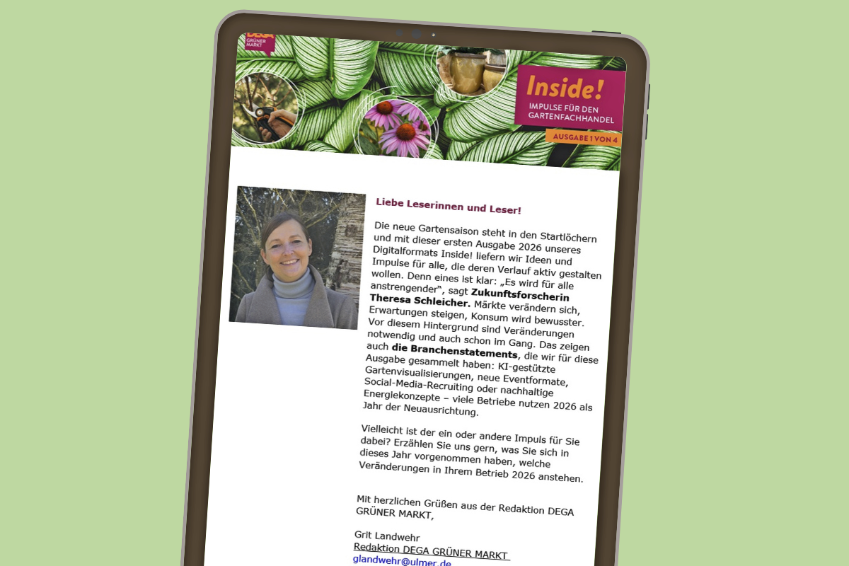 Die erste Ausgabe 2026 unseres Digitalformats Inside – Impulse für den Gartenfachhandel ist erschienen. Im Mittelpunkt der ersten Ausgabe steht die Frage: Wie muss sich der Gartenfachhandel jetzt aufstellen, um zukunftsfähig zu bleiben?