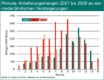 Die niederländische Veiling FloraHolland meldet für die ersten neun Wochen des Jahres 2009 bei den Zweijährigen rund 50 Prozent weniger Menge als im Vergleichszeitraum des Vorjahres. Da davon auszugehen ist, dass etwa gleiche Mengen wie in den Vorjahren kultiviert wurden, werden die Absatzzahlen in diesen Wochen, bei hoffentlich stabilerem Wetter, in die Höhe schnellen. Frühe Sätze, insbesondere bei Primeln, werden aber sicher die lange Wartezeit bis zum Verkauf nicht überstehen.HR