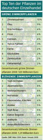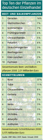 Nach Hochrechnungen und Schätzungen der ZMP, Zentrale Markt- und Preisberichtstelle, wurden für den deutschen Markt die jeweils wichtigsten zehn Pflanzen in den Marktsegmenten Schnittblumen, Beet- und Balkonpflanzen sowie blühende und grüne Zimmerpflanzen auf der Basis des Marktvolumens zu Einzelhandelspreisen für das Jahr 2008 zusammengestellt.