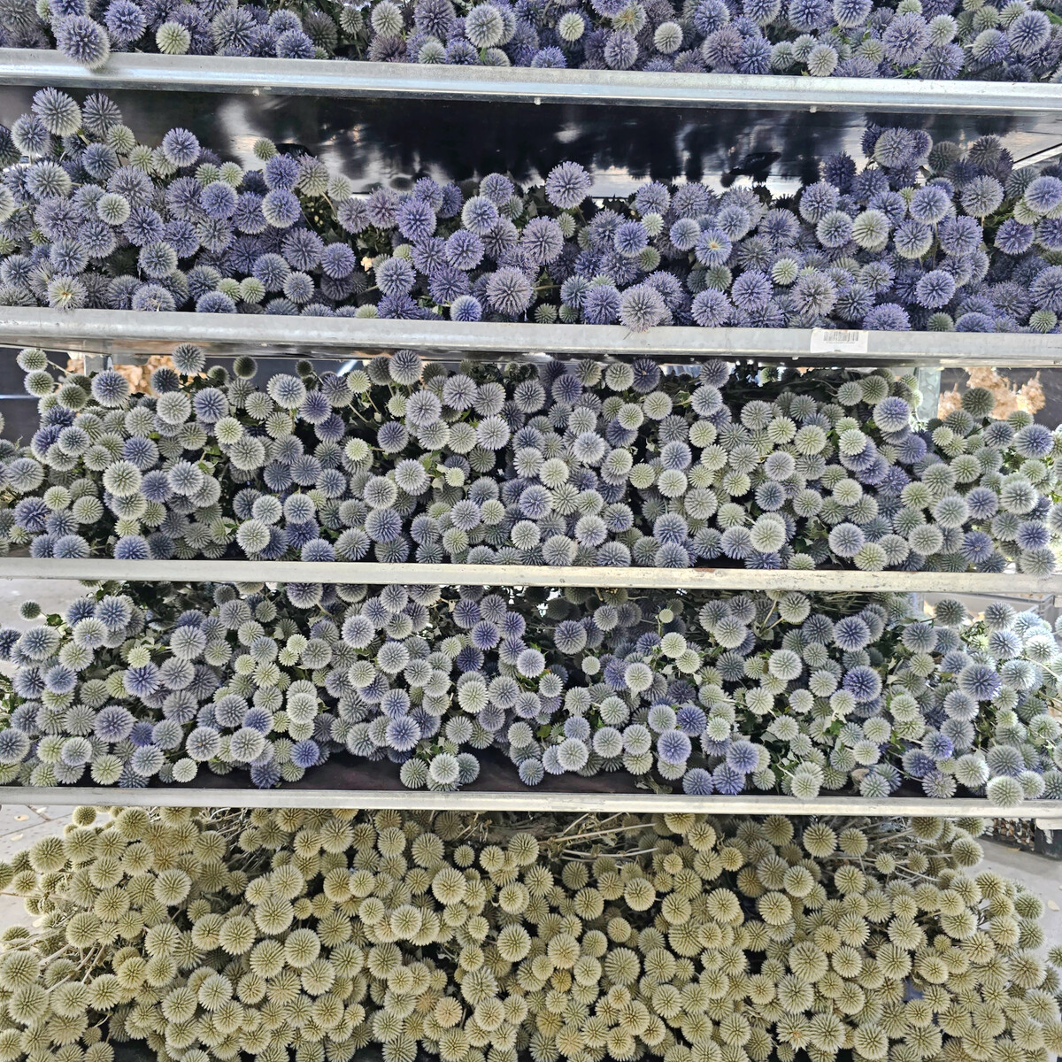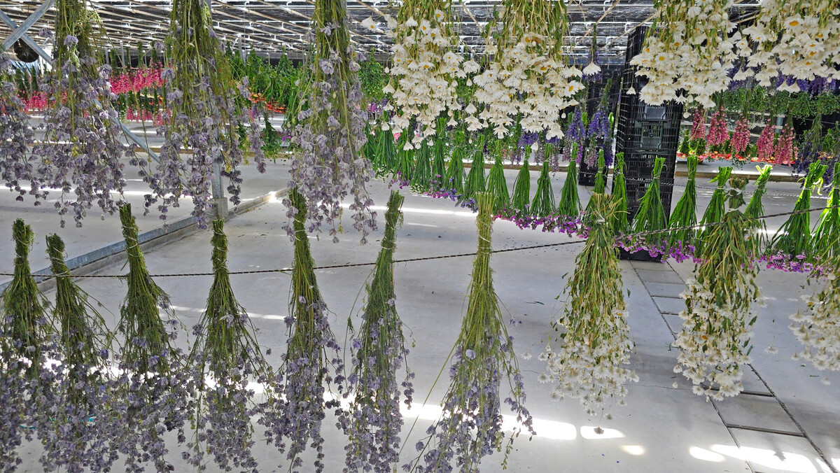 2Die Trockenblumen, die das Sortiment seit 2019 erweitern, benötigen ein bestimmtes Erntestadium; Resteverwertung führt zu Qualitätsminderungen. Je nach Verwendung als Frisch- oder Trockenblume unterscheidet sich der optimale Schnittzeitpunkt – nur bei Statice ist er identisch. Die Trocknung erfolgt im verdunkelten, warmen, gut belüfteten Gewächshaus und dauert bis zu einem Monat. Anschließend wird das Material in einem geschützten Dunkelraum gelagert; präventiv werden Nützlinge gegen Motten eingesetzt.