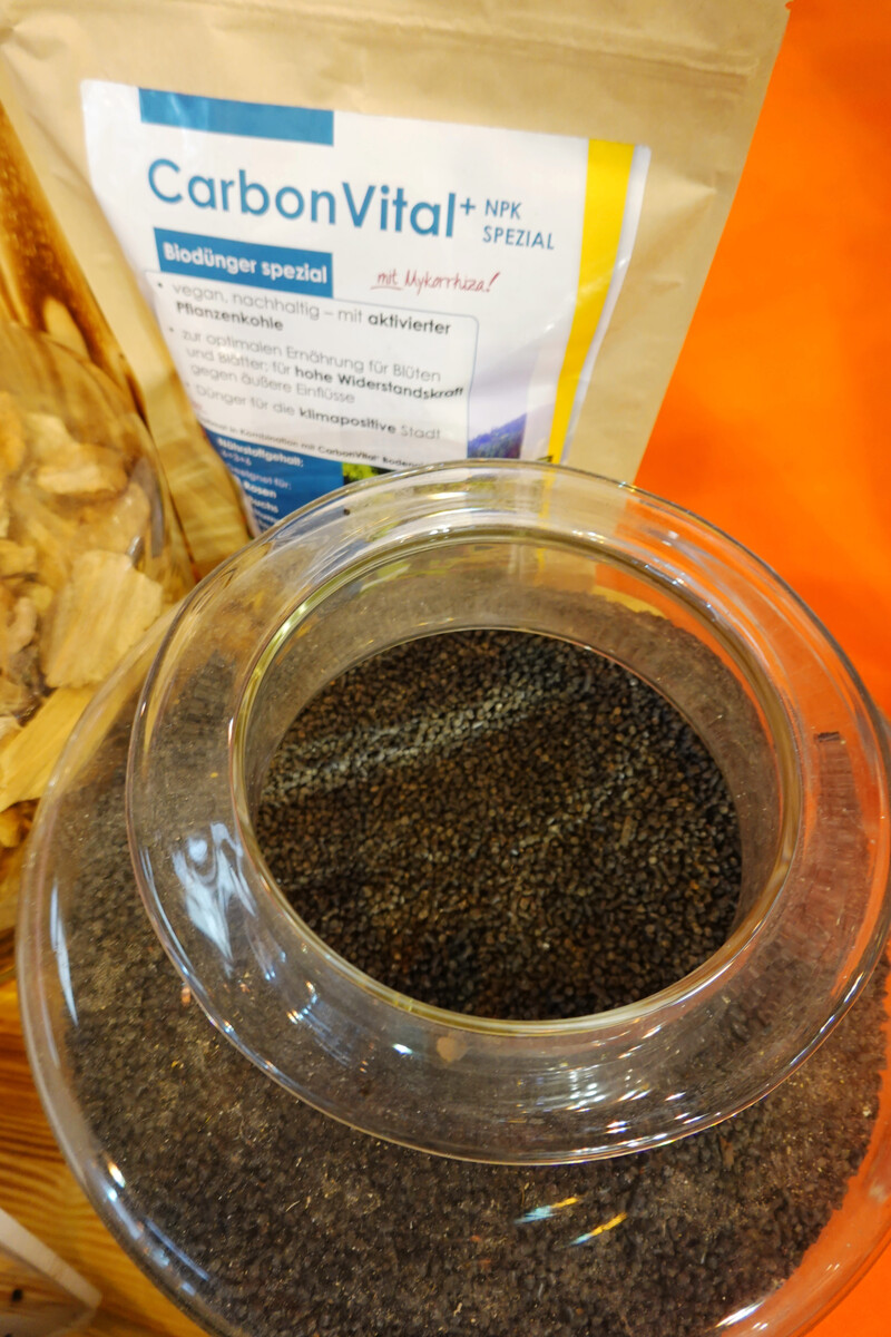 „Die Pflanzenkohle wird unter Luftabschluss fermentiert und anschließend zu 20 bis 60 % dem Substrat beigemischt oder bei Baumpflanzungen in den Boden, ins Pflanzloch, gegeben“, berichtete Anastasia Wagner, Knapkon. Verwendet wird ausschließlich zertifiziertes Holz aus deutscher Waldwirtschaft; die Pflanzenkohle und die daraus hergestellten Produkte sind FiBL-registriert, also für den Bio-Anbau zugelassen.