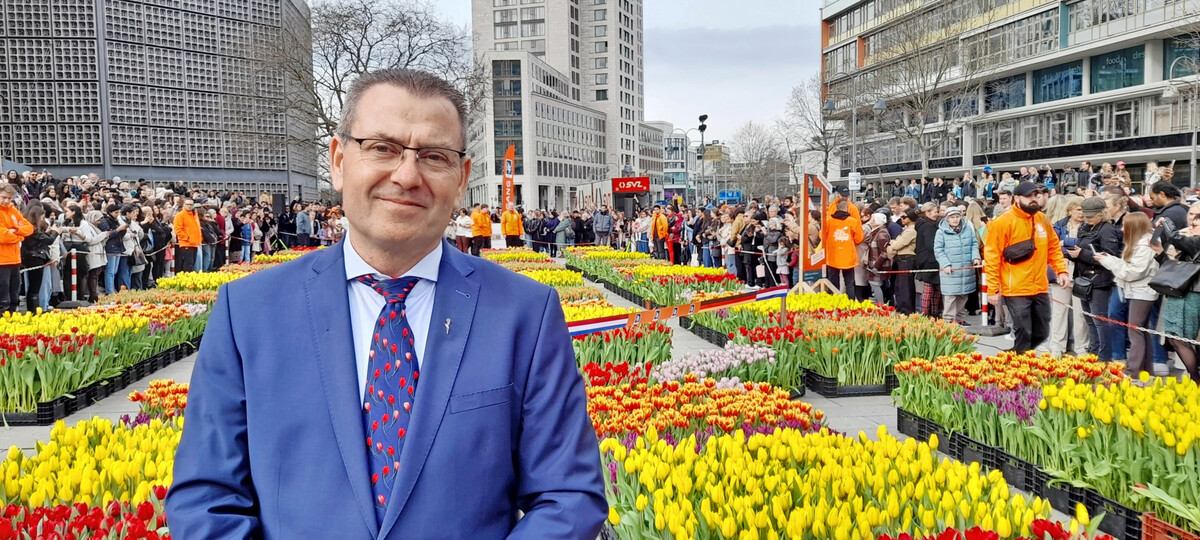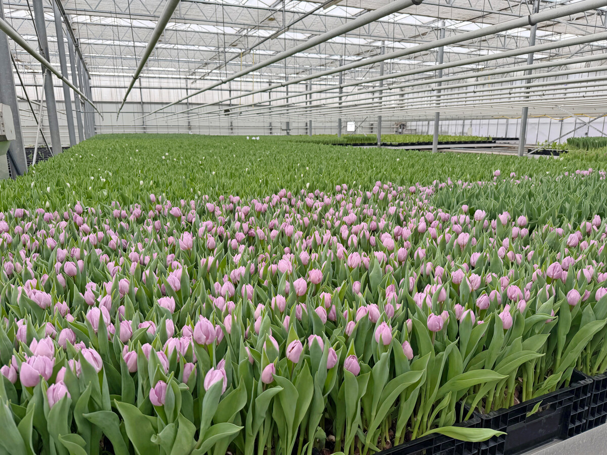 Lohnt sich denn der erhebliche Aufwand für Logistik und Transport der Pflanzen?Arjan Smit: Auf jeden Fall finde ich das lohnenswert! Deutschland ist für uns als Betrieb, aber auch für die Niederlande, sehr wichtig. Es ist schön, den deutschen Bürgern auf diese Weise etwas zu bieten und unsere engen Handelsbeziehungen zu stärken.Sie führen in Spierdijk, einem kleinen Ort in Nordholland, das Familienunternehmen Smitflowers in der dritten Generation. Seit wann besteht das Unternehmen?Arjan Smit: Der Betrieb wurde um 1938 von meinem Großvater gegründet. 1986 haben mein Vater und sein Bruder es übernommen. Ich habe das Unternehmen 1997 übernommen. In den ersten Jahren leitete ich es zusammen mit meinem Bruder, der sich etwas später dem Tomatenanbau gewidmet hat.Welche Ausbildung haben Sie?Arjan Smit: Ich habe die Grundschule besucht und in den letzten Schuljahren eine Fachausbildung im Bereich Blumenzwiebelanbau absolviert, wobei mein Vater mein wichtigster Lehrmeister war. Nach einiger Zeit habe ich mich mehr auf den internationalen Bereich ausgerichtet und daher auch meine Sprachkenntnisse verbessert.Wir bewirtschaften derzeit 40 ha, von Bordeaux (FR) bis in die Nähe von Groningen (NL). Das dient einer guten Verteilung der Arbeitsaufgaben.Wie viele Tulpen wachsen bei Ihnen? Und in welchen Ländern sind Ihre Kunden?Arjan Smit: Wir produzieren etwa 20 Millionen Tulpenzwiebeln pro Jahr. Davon verwenden wir ca. 11 Millionen für unsere eigene Blumenproduktion. Die andere, knappe Hälfte von etwa 9 Millionen Zwiebeln verkaufen wir an Kollegen oder sie gelangt ins Ausland.Wie viel Fläche unter Glas und wie viel im Freiland steht Ihnen zur Verfügung?Arjan Smit: Wir haben 5.500 m² Gewächshausfläche für den Anbau der Blumen. Derzeit bereiten wir gerade den Einbau einer zusätzlichen Ebene für den Anbau im Gewächshaus vor. Damit wollen wir den Energiebedarf senken und erwarten, dass wir effizienter arbeiten können. Im Freiland bewirtschaften wir Tulpenfelder auf einer Fläche von 40 ha.Wer ist Ihr Hauptabnehmer?Arjan Smit: Der größte Teil unseres Blumenexports geht in die Ukraine. Bedenkt man die Umstände, so klingt das vielleicht seltsam, aber wir hatten schon vor dem Krieg eine gute Zusammenarbeit und konnten diese glücklicherweise fortsetzen. Ich meine, das verschafft den Menschen dort doch einige Augenblicke des Beistands. Wenn ich in der Ukraine bin, sagen mir die Menschen immer: „Blumen sind gut für die psychische Gesundheit.“Wie erfolgt der Verkauf der Zwiebeln und der Blumen?Arjan Smit: Die meisten Blumen werden über die Blumenauktion verkauft. Allerdings kümmere ich mich ganz persönlich um unseren Exportbereich. Den Verkauf der Blumenzwiebeln wickeln wir häufig über einen Kommissionär ab. Er bringt Angebot und Nachfrage zusammen. Auch dabei habe ich meine eigenen Kanäle. Überhaupt stecken wir viel Energie in Vertriebskanäle und können erkennen, wie sich die Welt ständig verändert. Räumliche Entfernung ist ja heutzutage kein Problem mehr. Außerdem nutzen wir auch Messen im eigenen Land, wie die internationale Trade Fair Aalsmeer. Als größte internationale Fachmesse für Blumen und Pflanzen zieht sie bis zu 700 ausstellende Unternehmen und mehr als 20.000 Besucher an. Selbstverständlich sind wir dabei mit einem Stand vertreten und nutzen die Veranstaltung unter anderem, um neue Kontakte zu knüpfen.Wie viele verschiedene Sorten haben Sie im Programm? Welche Farben bevorzugen die Kunden, welche aktuellen Trends erkennen Sie?Arjan Smit: Das ist von Land zu Land oder von Region zu Region sehr unterschiedlich. Deshalb konzentrieren wir uns auf ein breites Sortiment, um die Kunden entsprechend ihrer Wünsche beliefern zu können. Unser Unternehmen bringt rund 25 verschiedene Sorten in fast allen Farben auf den Markt.Sind Tulpen Ihr einziger Schwerpunkt, oder produzieren Sie auch andere Blumen?Arjan Smit: Wir konzentrieren uns ganz auf Tulpen, auch wenn ich in meinem Exportgeschäft mit verschiedenen anderen Blumen arbeite. Neben Tulpen sind das vor allem Rosen.