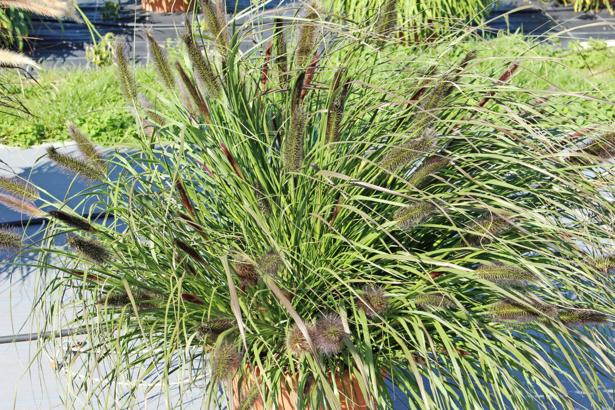 - Pennisetum alopecuroides ‘Ginger Love’ (Kientzler): Ein mittelkompaktes Gras, das mit den im Spätsommer erscheinenden, gut 10 cm langen Blütenbüscheln insgesamt bis zu 80 cm hoch wird. Durch die späte Lieferung in KW 16 erfolgte die Pflanzung (ohne Anzucht) direkt im Freilandkübel oder -beet. Besonders hervorzuheben ist, dass dieses Gras kräftige, stabile Triebe hervorbrachte, welche sich auch bei Niederschlägen (auch nach Blühbeginn) kaum flachlegten.